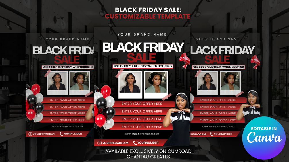 Make your Black Friday promo look as flawless as your work. This fully editable Canva template helps beauty CEOs create eye-catching, professional sale posts that attract clients and increase sales — in minutes, not hours.